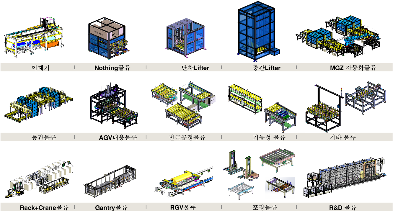 2차전지 물류 자동화 설비 적용 장비현황 2차전지 물류 자동화 설비 화성공정 물류 자동화 제품이송, 트레이이송, 동간이송, 수직이송 설계 최적화, 최고 품질, 최저 비용 물류자동화 시스템 구축